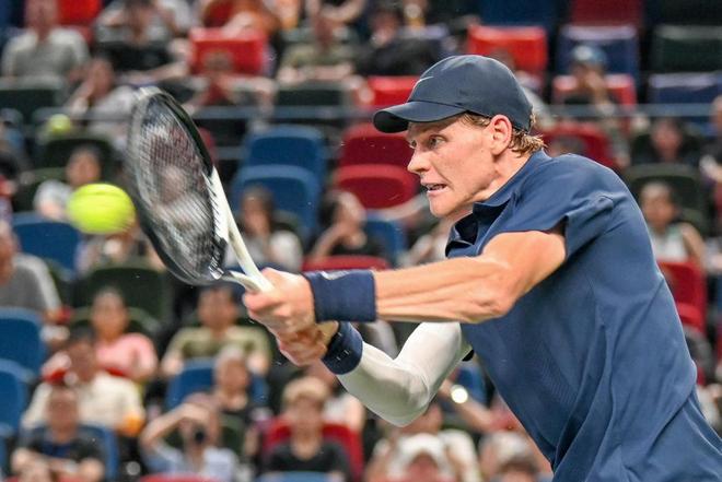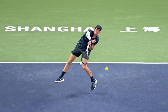 2025年10月4日,上海,久事体育场馆旗忠网球中心,辛纳在比赛中击球。澎湃新闻记者 朱伟辉 图