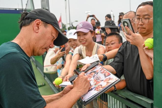 2025年10月7日,上海,久事体育场馆旗忠网球中心,张德培在自己当年法网夺冠的照片上给球迷签名。澎湃新闻记者 朱伟辉 图