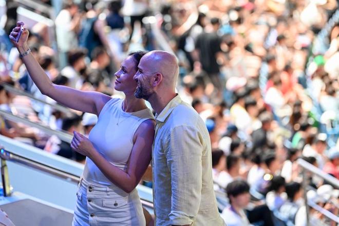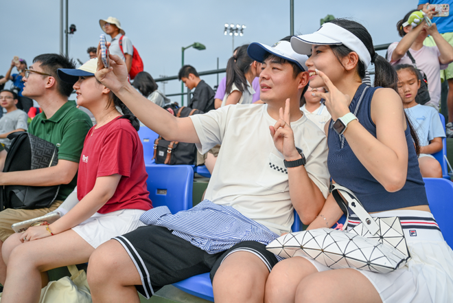 2025年10月7日,上海,久事体育场馆旗忠网球中心,比赛间隙,两名外国观众在自拍。澎湃新闻记者 朱伟辉 图