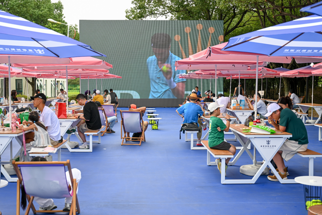2025年10月8日,上海,久事体育场馆旗忠网球中心,观众在户外一边就餐,一边看比赛。澎湃新闻记者 朱伟辉 图