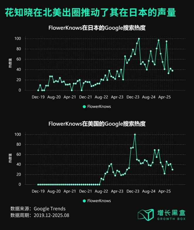 而且有意思的是,回头来看,花知晓在2019-2022阶段布局日本时,并没有充分打开在日本市场的声量和影响力,反而是2023-2025年在北美的出圈,将其在日本市场的声量再拔高了一个量级。