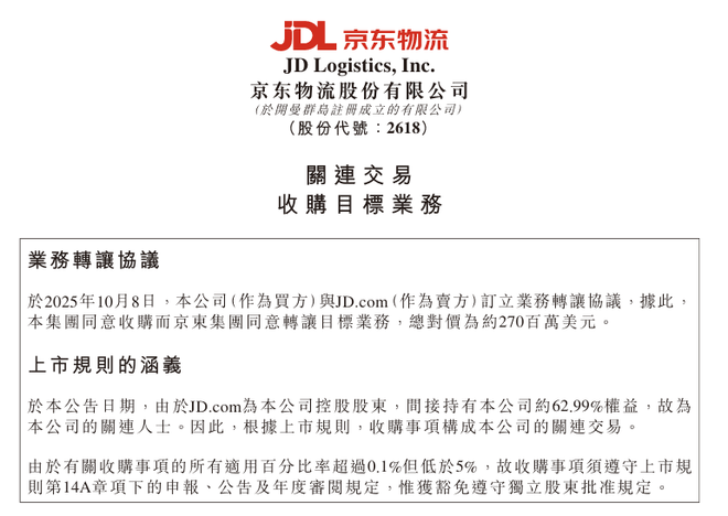 公告显示,JD.com作为京东物流的控股股东,间接持有京东物流约62.99%的权益,故为京东物流的关联人士。因此,根据上市规则,收购事项构成该公司的关联交易。