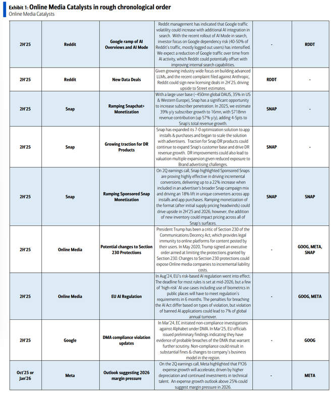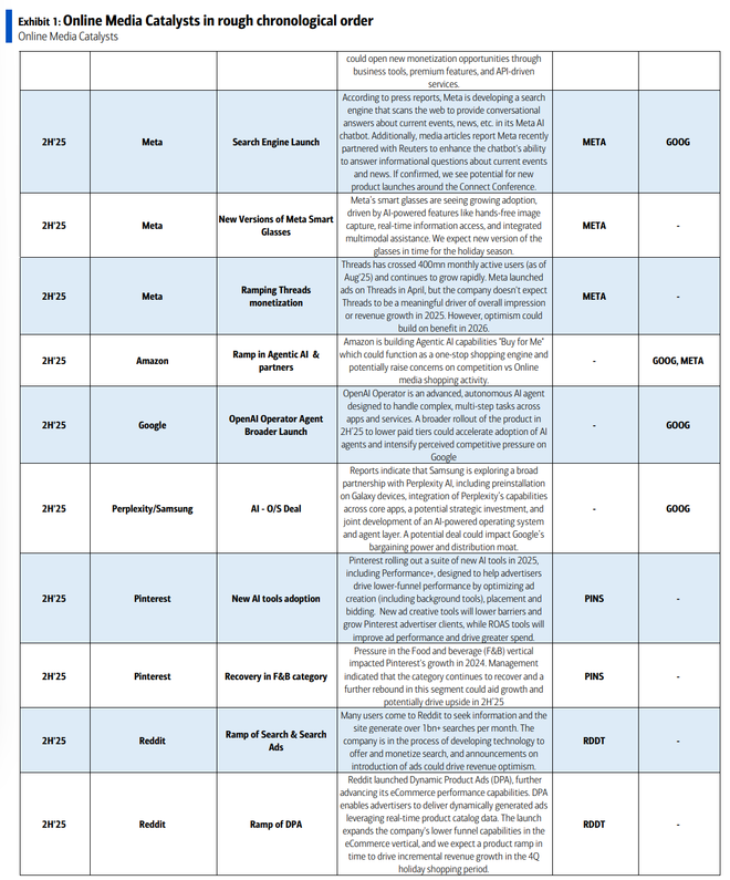 Reddit正在开发技术以提供和变现搜索功能,搜索广告的推出可能推动收入预期上升。Pinterest则在推出Performance+等新AI工具,旨在帮助广告主优化广告创建、投放和竞价,推动下漏斗业绩表现。