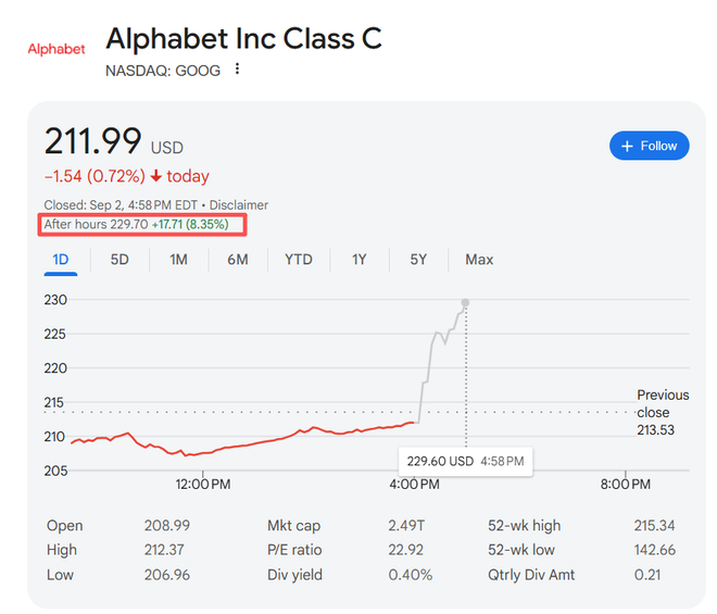 最新裁决结果显示,美国联邦法官裁决,谷歌可以保留其Chrome浏览器,但将被禁止签署独家合约并必须共享搜索数据。这项裁决被市场解读为谷歌的重大胜利,母公司Alphabet股价在盘后交易中一度大涨超8%。