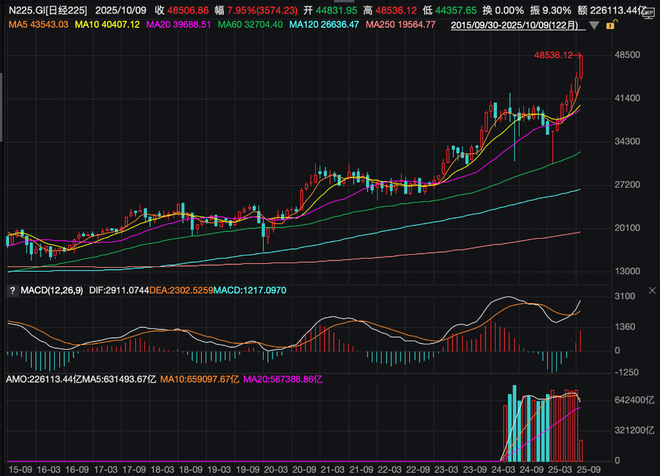 10月9日,受科技股提振,亚洲股市多数上涨。日经225指数、东证指数均创历史新高,软银集团领涨,盘中涨超13%,创历史新高。