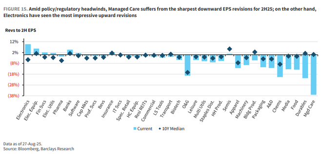 这种强劲表现主要由少数板块驱动。TMT(科技、媒体、电信)特别是大型科技股,以及金融板块仍是标普500每股收益增长、利润率上升和经营杠杆的主要来源。相比之下,除亚马逊外的消费股、材料和公用事业板块表现疲弱,本季度每股收益增长较其长期增长节奏的落后幅度最大。