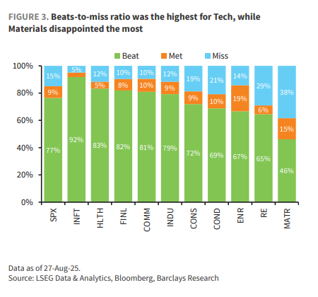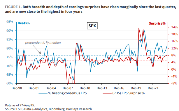 巴克莱表示,2025年二季度财报季交出了亮眼成绩单。标普500每股收益同比增长10.6%,销售增长6.1%,盈利惊喜的广度和深度均高于长期趋势。超预期率和惊喜幅度均接近四年来最高水平。