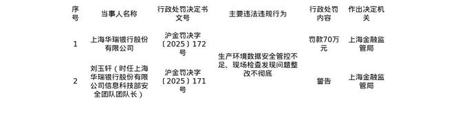 罚单显示,上海华瑞银行股份有限公司的主要违法违规事实(案由)为:生产环境数据安全管控不足,现场检查发现问题整改不彻底。