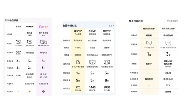 差不多同时期,腾讯视频、优酷等也悄然调整会员体系,将4K高清、杜比视听、多设备同时登录等权益,从原有VIP中剥离,划归至价格更高的超级影视SVIP或家庭套餐。
