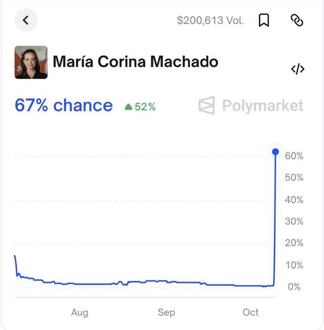 据媒体周六报道,在委内瑞拉反对派领袖María Corina Machado获得2024年诺贝尔和平奖之前12小时,一名代号"6741"的新注册用户在加密货币预测市场Polymarket上大笔买入,将María Corina Machado的获奖概率从5%大幅推高至70%,最终斩获超过5万美元利润。