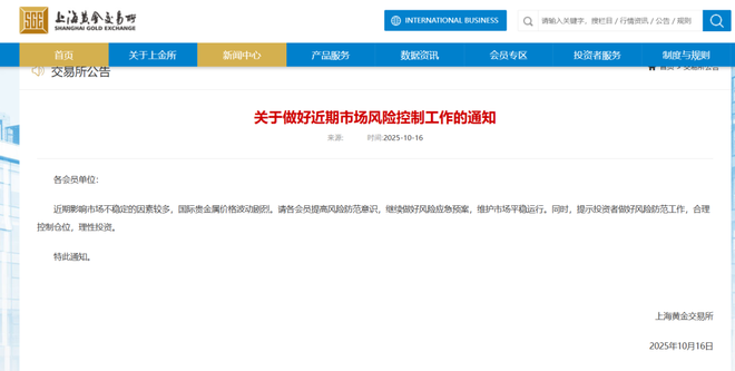 据上海黄金交易所网站消息,针对近期国际贵金属价格波动剧烈,上海黄金交易所10月16日向各会员单位发布关于做好近期市场风险控制工作的通知。