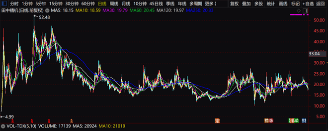 业绩不给力,田中精机股价近年来也一直低迷。截至10月17日收盘,田中精机报17.61元/股,较2016年高点跌幅达66%。