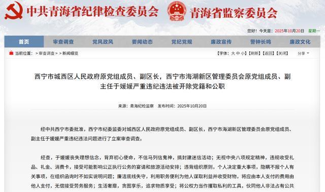 据青海纪检监察20日消息,经中共西宁市委批准,西宁市纪委监委对城西区人民政府原党组成员、副区长,西宁市海湖新区管理委员会原党组成员、副主任于媛媛严重违纪违法问题进行了立案审查调查。