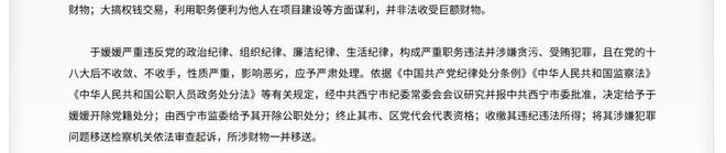 于媛媛严重违反党的政治纪律、组织纪律、廉洁纪律、生活纪律,构成严重职务违法并涉嫌贪污、受贿犯罪,且在党的十八大后不收敛、不收手,性质严重,影响恶劣,应予严肃处理。依据《中国共产党纪律处分条例》《中华人民共和国监察法》《中华人民共和国公职人员政务处分法》等有关规定,经中共西宁市纪委常委会会议研究并报中共西宁市委批准,决定给予于媛媛开除党籍处分;由西宁市监委给予其开除公职处分;终止其市、区党代会代表资格;收缴其违纪违法所得;将其涉嫌犯罪问题移送检察机关依法审查起诉,所涉财物一并移送。