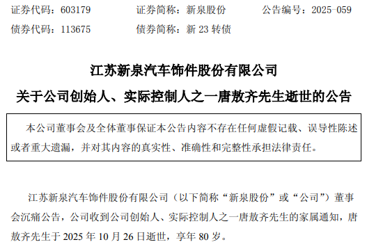 10月27日早间,新泉股份(603179)公告,公司收到公司创始人、实际控制人之一唐敖齐先生的家属通知,唐敖齐先生于2025年10月26日逝世,享年80岁。