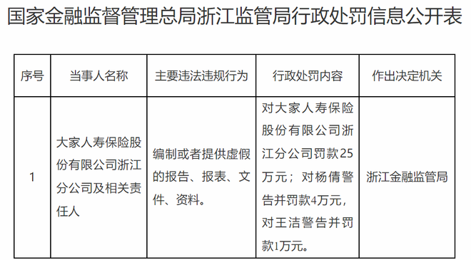 10月27日,国家金融监督管理总局浙江监管局发布的行政处罚信息显示,因编制或者提供虚假的报告、报表、文件、资料,大家人寿保险股份有限公司浙江分公司被罚款25万元,相关责任人杨倩被警告并罚款4万元,王洁被警告并罚款1万元。