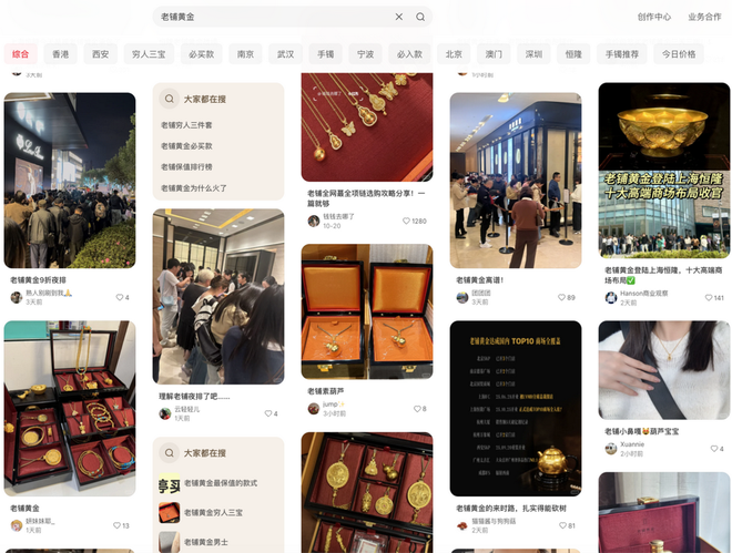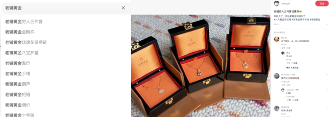 在小红书搜索"老铺黄金",首条推荐便是"老铺黄金穷人三件套",即克重相对较小、总价相对较低的单品。