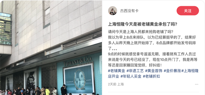 店门口的牌子上写着:"部份款式已经断货",小红书上关于老铺黄金"断货""排队攻略""涨价款式"的帖子仍在刷屏。
