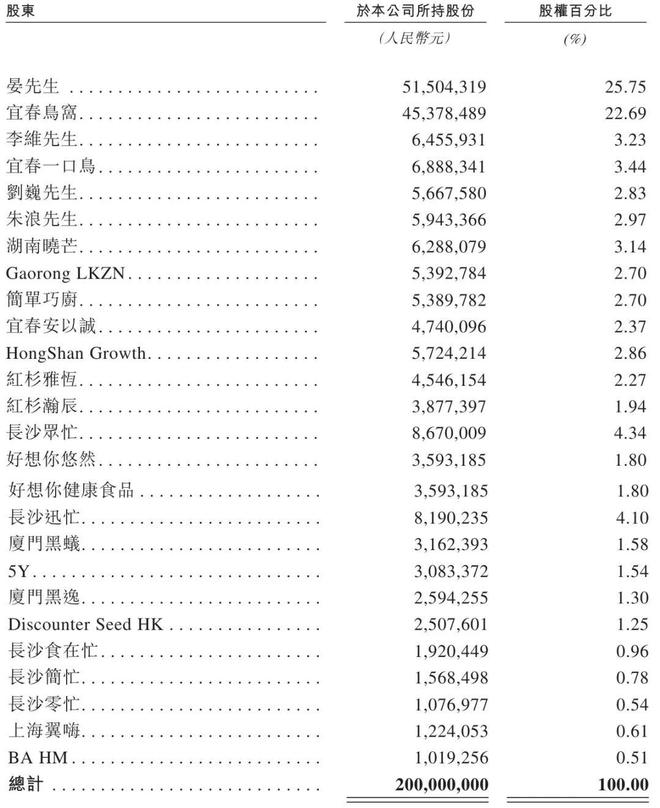 IPO前,晏周持股25.75%,宜春鸟窝持股22.69%,李维持股为3.23%,宜春一口鸟持股3.44%,刘巍持股为2.83%,朱浪持股为2.97%,湖南晓芒持股为3.14%,Gaorong LKZN持股为2.7%,简单巧厨持股为2.7%;
