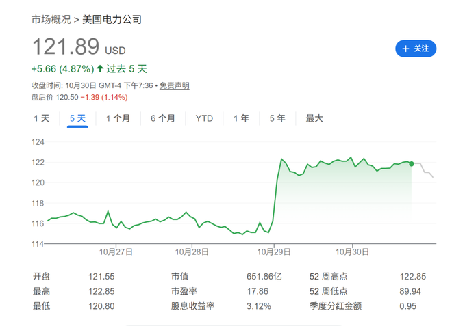 当地时间10月29日,这家美国大型公用事业公司宣布,其未来五年的资本支出计划将激增33%,达到720亿美元。消息发布后,市场反应积极,AEP股价周三上涨6%,现至每股121.89美元。