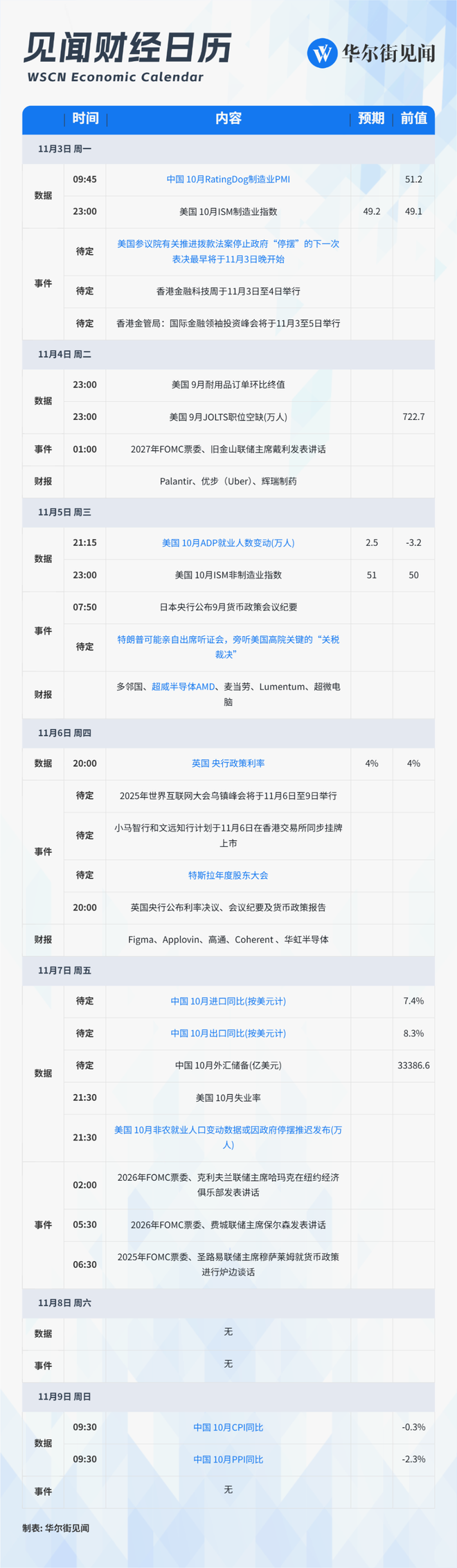 下周重点关注:中国10月CPI、PPI、进出口、外储、PMI数据,美国就业数据,英国央行政策利率。美高院开审关税。特斯拉年度股东大会。美联储委员降息后首度发声。美政府停摆是否结束或在11月3日见分晓。