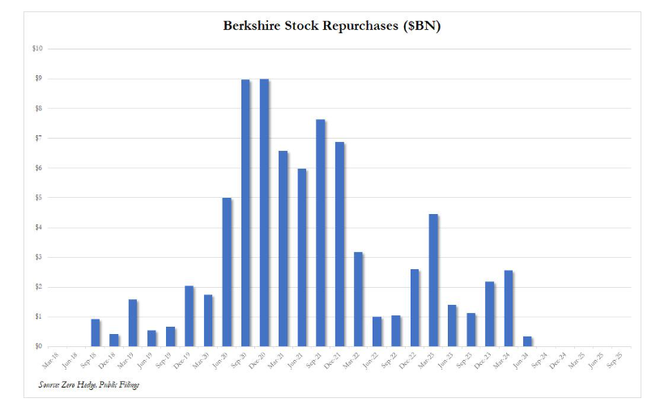 除了减持股票投资组合,伯克希尔在回购自家股票方面也保持了极大的克制。自2024年第二季度以来,公司便再未进行过任何回购。