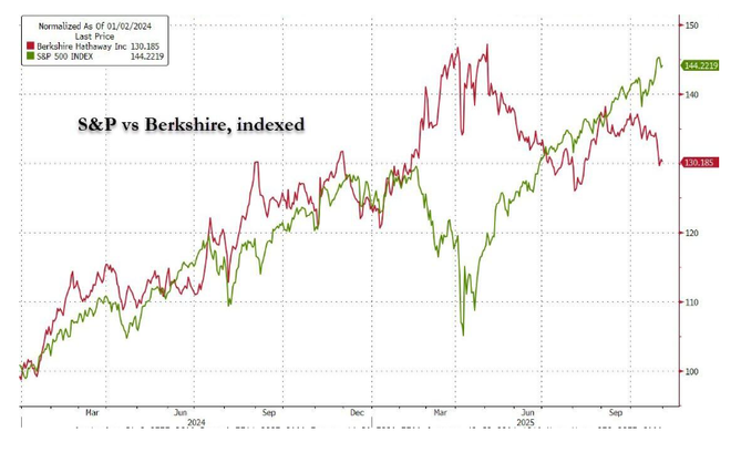 持续的抛售和暂停回购“或许可以解释为什么伯克希尔的股价一直显著落后于大盘,目前已回落至去年八月的水平。 ”