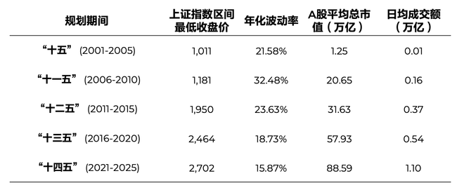 以往五年规划期间,资本市场有怎样的表现?通过梳理"十五"到"十四五"的数据,可以看到,从"十五"计划(2001年)至今,中国资本市场呈现出规模与质量的协同发展。上证指数在每个五年规划周期中的低点逐步抬高,年化波动率整体收窄,彰显市场稳定性在持续增强。此外,A股平均总市值与日均成交额也在稳步增长,表明市场容量与流动性不断提升。