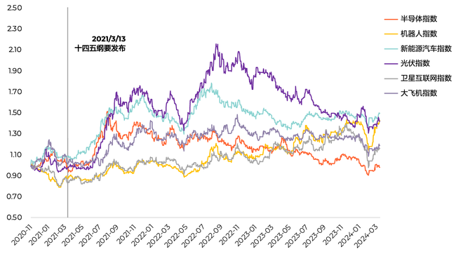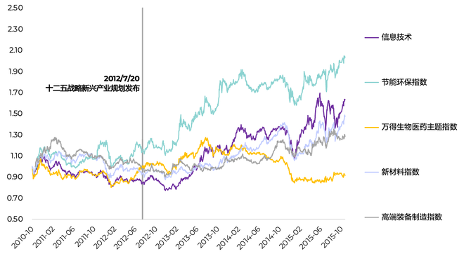 从行业角度来看,"十二五"至"十四五"规划所提及的新兴产业在市场中又有哪些表现呢?通过梳理三个规划期内相关新兴产业的市场表现可以发现,各行业表现存在一定差异。