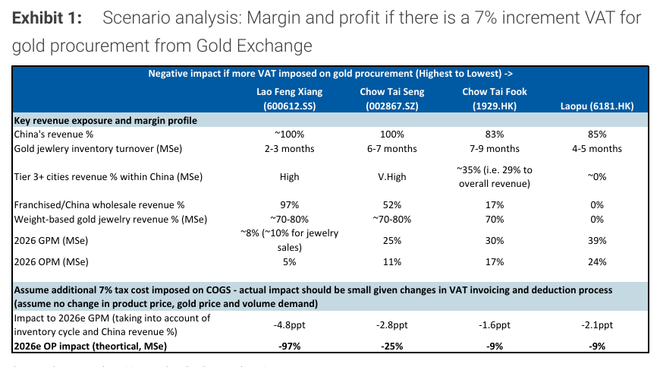 摩根士丹利的情景分析显示,在额外征收7%税收成本的假设下,不同珠宝商面临的冲击程度存在显著差异。