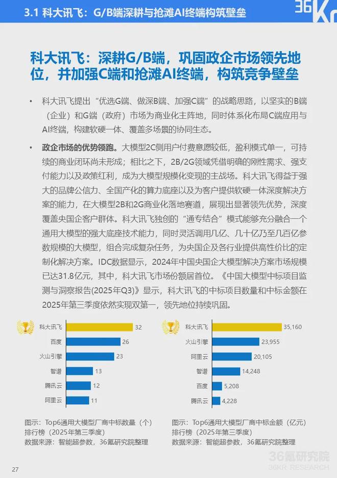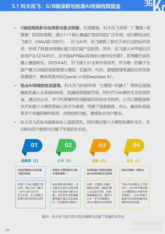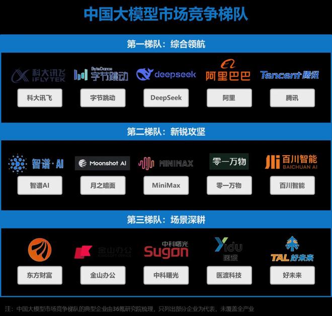 当前,中国大模型领域已进入体系化竞争阶段,市场呈现出多元且复杂的竞争态势。市场参与者主要可划分为以下五类主体:以全栈布局构建护城河的互联网/科技巨头、以技术锐度著称的专注于模型的新贵、以行业纵深创造价值的垂直领域深耕者、在转型中寻求突破的AI 1.0转型者,以及作为创新源头的科研机构。其中,部分企业通过多维度能力建设取得跨越式发展,如科大讯飞凭借其百万量级的开发者生态、在语音与多语种技术领域的持续突破、政企市场的规模化落地能力以及在具身智能等前沿领域的创新布局,构建了全面的综合竞争优势,位居行业玩家第一梯队。