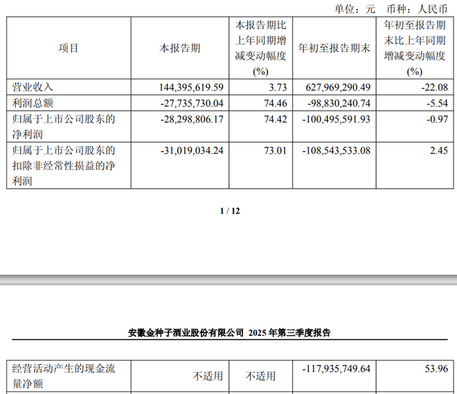 10月29日,金种子酒(600199)公布2025年三季报,公司前三季营业收入为6.28亿元,同比下降22.08%;归母净利润自去年同期亏损9953万元变为亏损1亿元,亏损额进一步扩大;扣非归母净利润自去年同期亏损1.11亿元变为亏损1.09亿元,亏损额有所减少;经营现金流净额为-1.18亿元,同比增长53.96%。