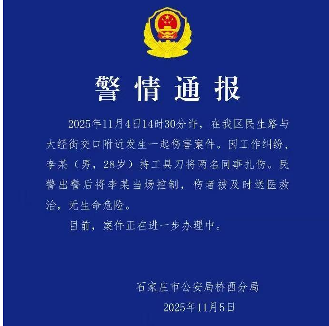 11月5日,石家庄市公安局桥西分局发布警情通报:2025年11月4日14时30分许,在桥西区民生路与大经街交口附近发生一起伤害案件。因工作纠纷,李某(男,28岁)持工具刀将两名同事扎伤。民警出警后将李某当场控制,伤者被及时送医救治,无生命危险。目前,案件正在进一步办理中。
