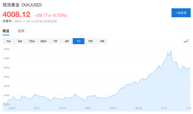现货黄金涨0.73%,报4008.12美元/盎司。