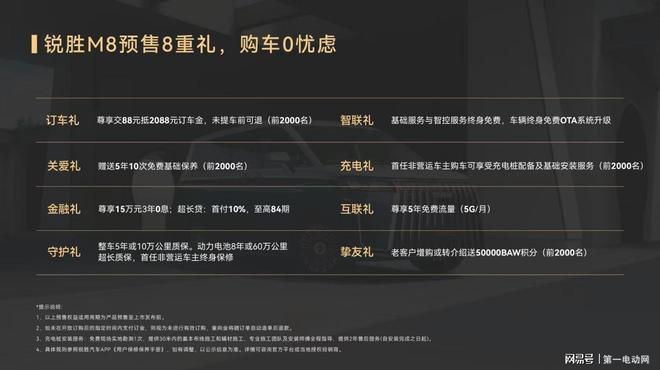 新程启幕,权益护航。预售期间下订用户可享限时权益,尊享价值至高2.98万元的八项专属好礼,全程尽享无忧体验。