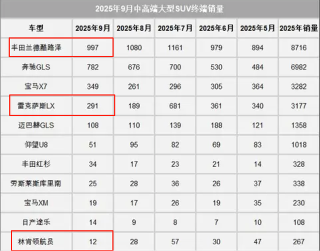 同样遭遇的还有丰田兰德酷路泽,9月销量跌破千辆大关,停留在997辆;林肯领航员9月仅售出12辆。