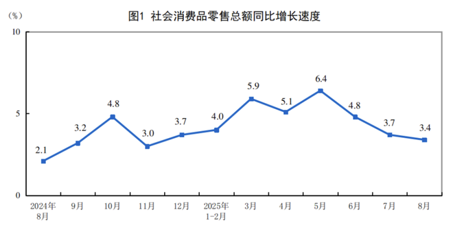 汽车稳增长、家电谋升级、3C调结构,国补的流水重塑了制造业的上下游。但这种增长仍是短期的。在财政杠杆的放大下,企业提前兑现了未来的销量,消费者提前透支了后续的需求。国家统计局数据显示,2025年8月份,社会消费品零售总额39668亿元,同比增长3.4%,增速自五月以来接连放缓。