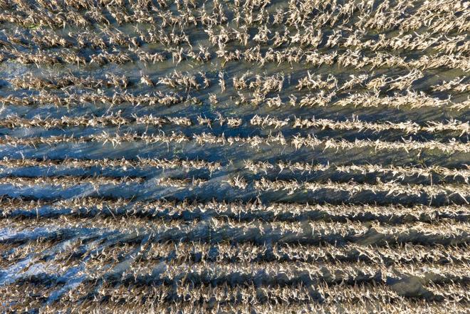 2025年11月5日,河南周口,李埠口村河堤积水农田与收割后的玉米杆。 视觉中国 图