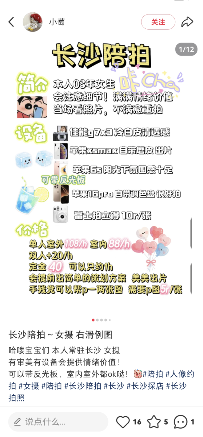 这8000元也为小萄提供了一种可量化的陪拍价值。她在小红书上宣传自己时,会标明自己的设备有佳能G7X3、iPhone XS Max、iPhone 6S、富士拍立得等,并在每一款设备旁边都标注诸如「冷白皮清透感」、「自带磨皮」等推荐理由。