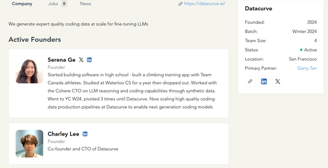Serena Ge曾在Cohere实习,参与大语言模型的训练项目。Cohere是一家从事大型语言模型和AI产品开发与商业化的人工智能技术公司,致力于提高内部模型的推理能力和代码生成能力;相比之下,Datacurve则专注于外部数据收集,致力于构建更高质量、更具挑战性的编码数据集。两家公司的性质差异决定其天然是上下游合作伙伴,而这种技术合作也延续到资本层面,Cohere后来成为Datacurve的早期投资人之一。