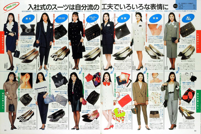 淡粉色、双排扣略带垫肩的西装外套是泡沫经济时期日本女性在职场中常见的搭配,象征着当时日本社会对于女性在职场完美形象的想象——优雅、干练且温柔。