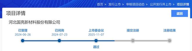 据查,国亮新材于2024年6月26日上市材料获得北交所受理,2025年1月完成首轮问询回复,2025年11月7日上会并获得“通过”结果。但按照注册制“问询-落实-注册”环节,公司仍需解决本次上市委提出的“落实意见”后方可进入证监会注册程序。