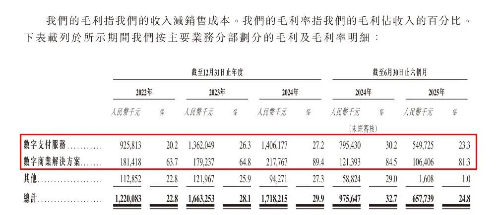 不过,数字支付服务的盈利能力却略显疲软。招股书显示,这一业务的毛利率偏低,2022年-2024年,数字支付服务毛利率为20.2%、26.3%、27.2%。