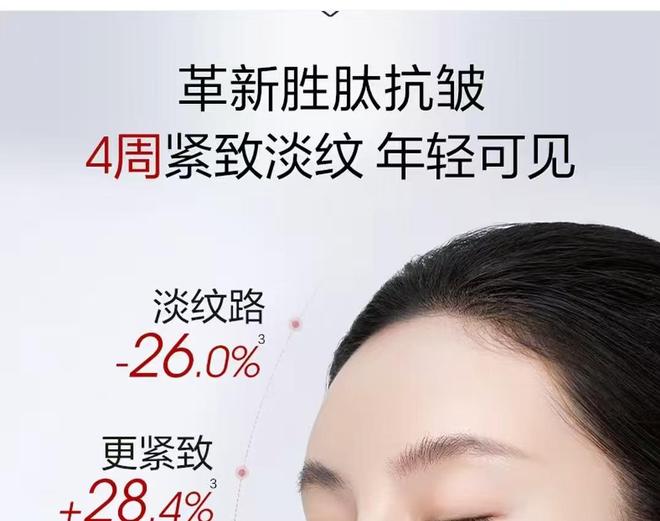 在产品详情页,品牌更是加码宣传,称其专研的胶原自启科技源于跨领域抗老核心理念,能一键开启6维新生力,甚至给出“4周紧淡纹、年轻可见”的明确时效承诺。