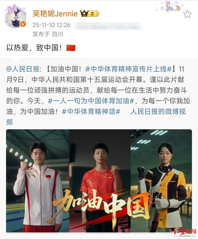 备受关注的四川籍运动员吴艳妮将代表四川出征本届全运会,参加女子100米栏的金牌争夺。11月10日,吴艳妮的个人社交账号更新动态,转发了中华体育精神宣传片《加油中国!》,并配文:以热爱,致中国!