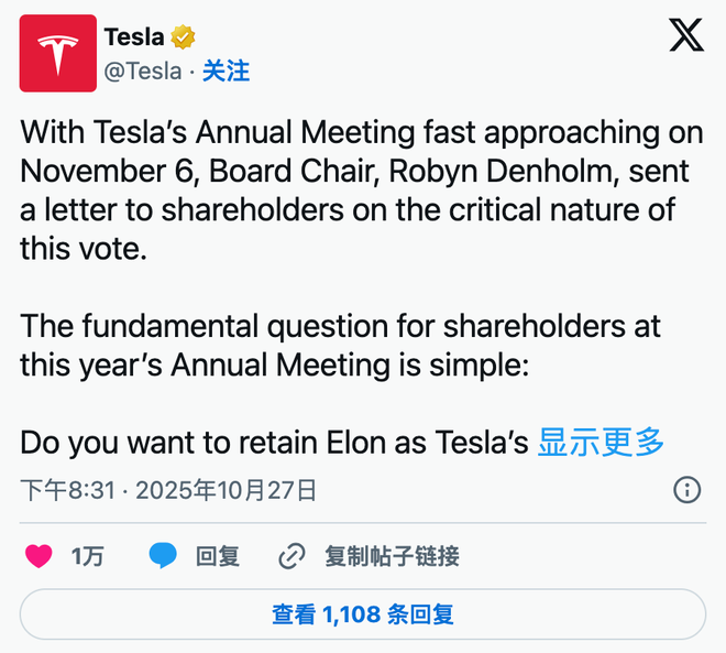 事实上,在2024年的股东大会上,特斯拉股东即被敦促投票支持向马斯克支付500亿美元的巨额薪酬,以确保他继续担任首席执行官。