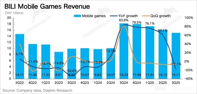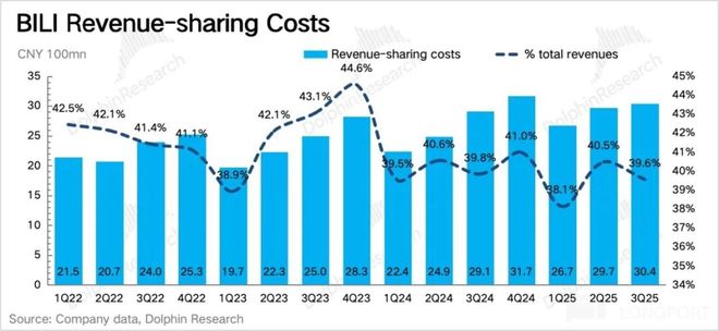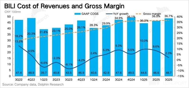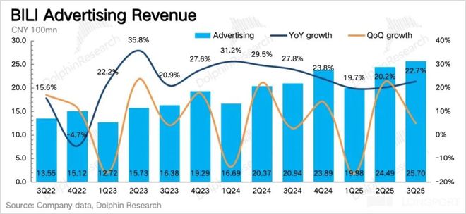 三季度 B 站广告收入超 25.7 亿,同比增长 22%,高于指引和预期。广告增长主要受益生态内用户时长增加(+16%yoy),以及公司对广告算法、投放系统与 AIGC 创意工具的升级。其中,超过 50% 的广告素材已通过 AIGC 自动生成,显著提升制作效率与转化效果。