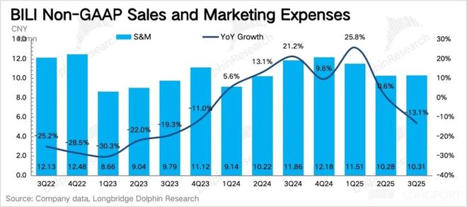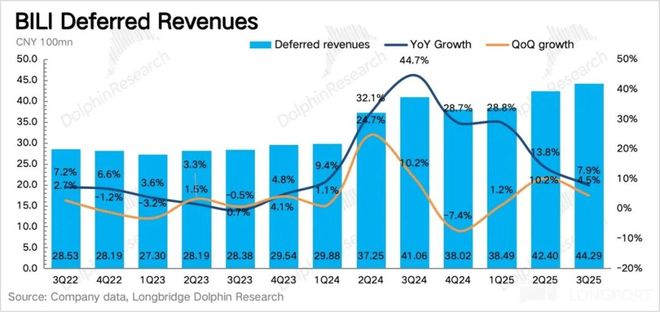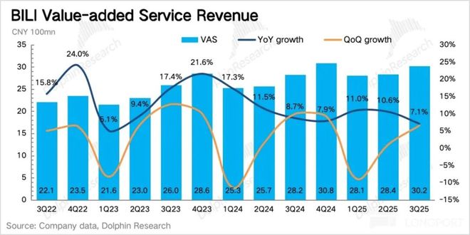 直播 + 大会员订阅为主的 VAS 增值服务收入,三季度同比增长 7%,环比增速显著放缓。