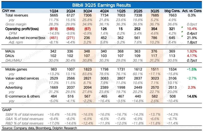 北京时间 11 月 14 日港股盘后,哔哩哔哩发布 2025 年三季度财报,整体看小超预期,亮点在广告收入、利润和用户指标,游戏和直播则相对不佳。财报后当天市场反应平淡,主要还是大盘影响,此外部分资金可能介意短期指引惊喜不足。