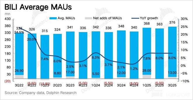 1. 用户生态健康扩张:这是海豚君认为的财报最大亮点。Q3 是暑假旺季,B 站月活 MAU 环比净增 1300 万人,DAU/MAU 提升至 31.2%。B 站生态的重新扩张从年初开始,去年因为 MAU 增长放缓,公司一度不再明列MAU 指标,并引导市场关注 DAU。